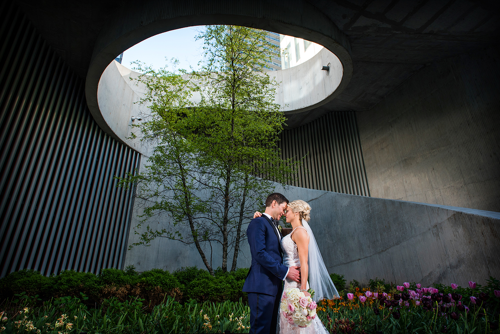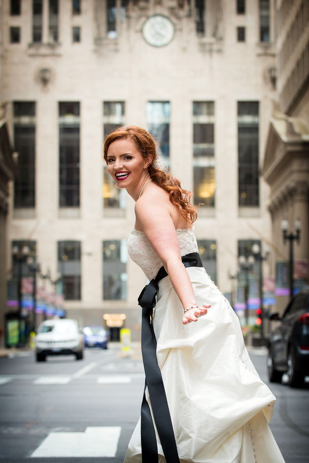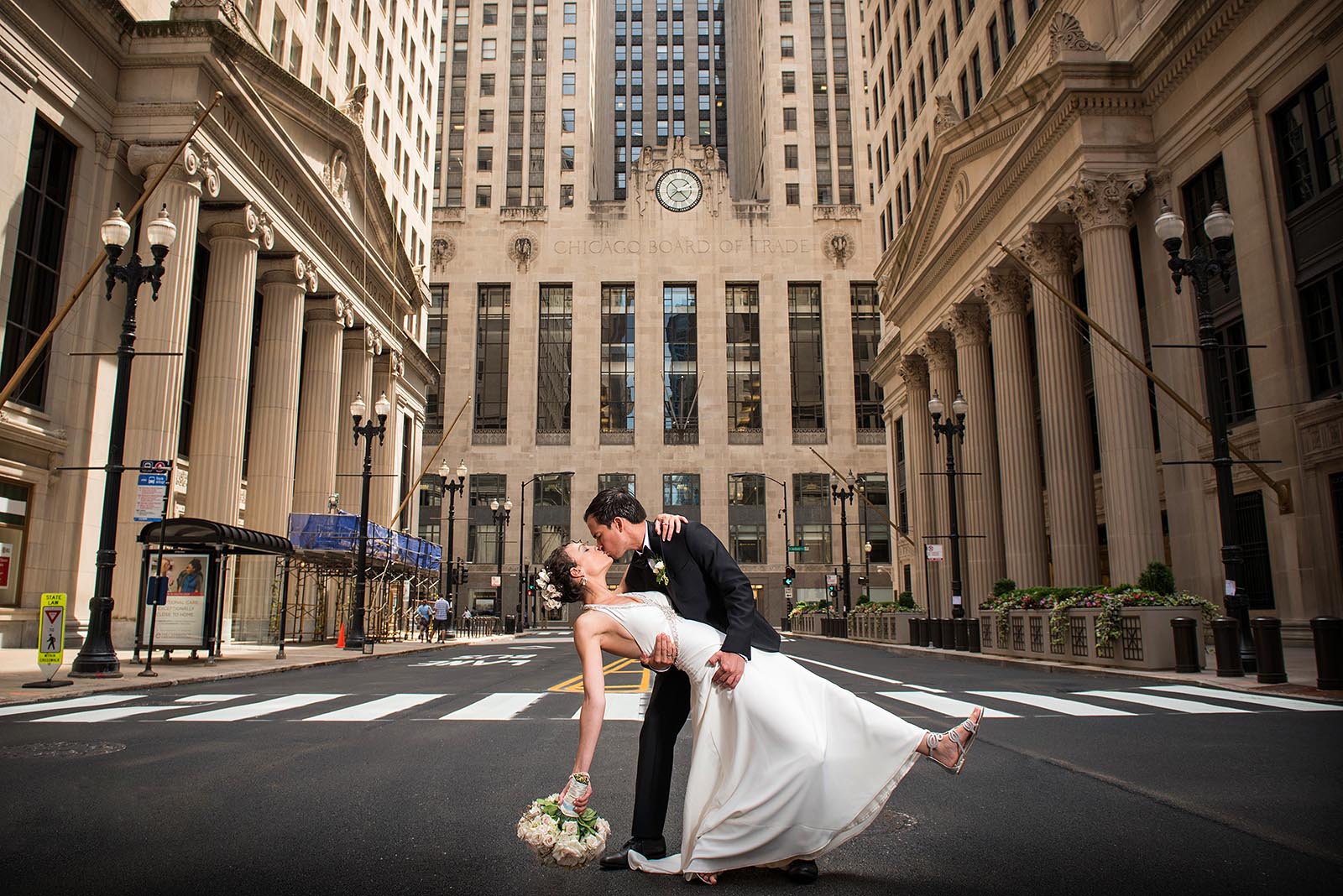 Best Board of Trade Bride and Groom Portrait: Juan taking Alyssa for the plunge in front of the Chicago Board of Trade on LaSalle Street