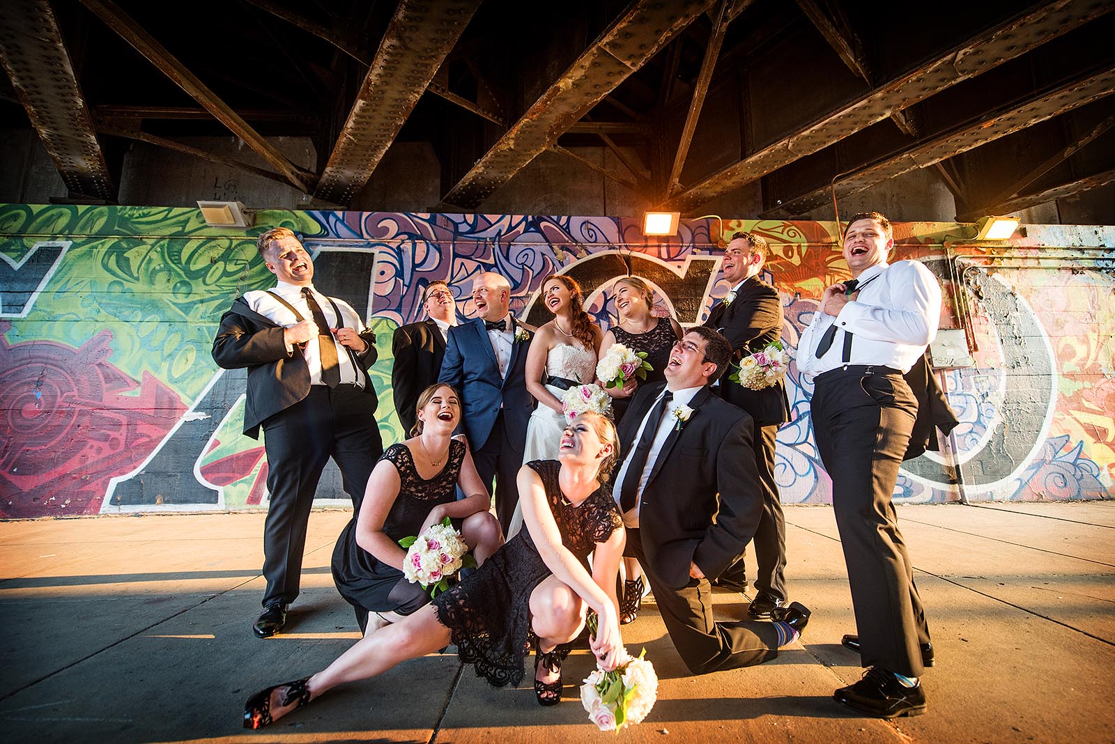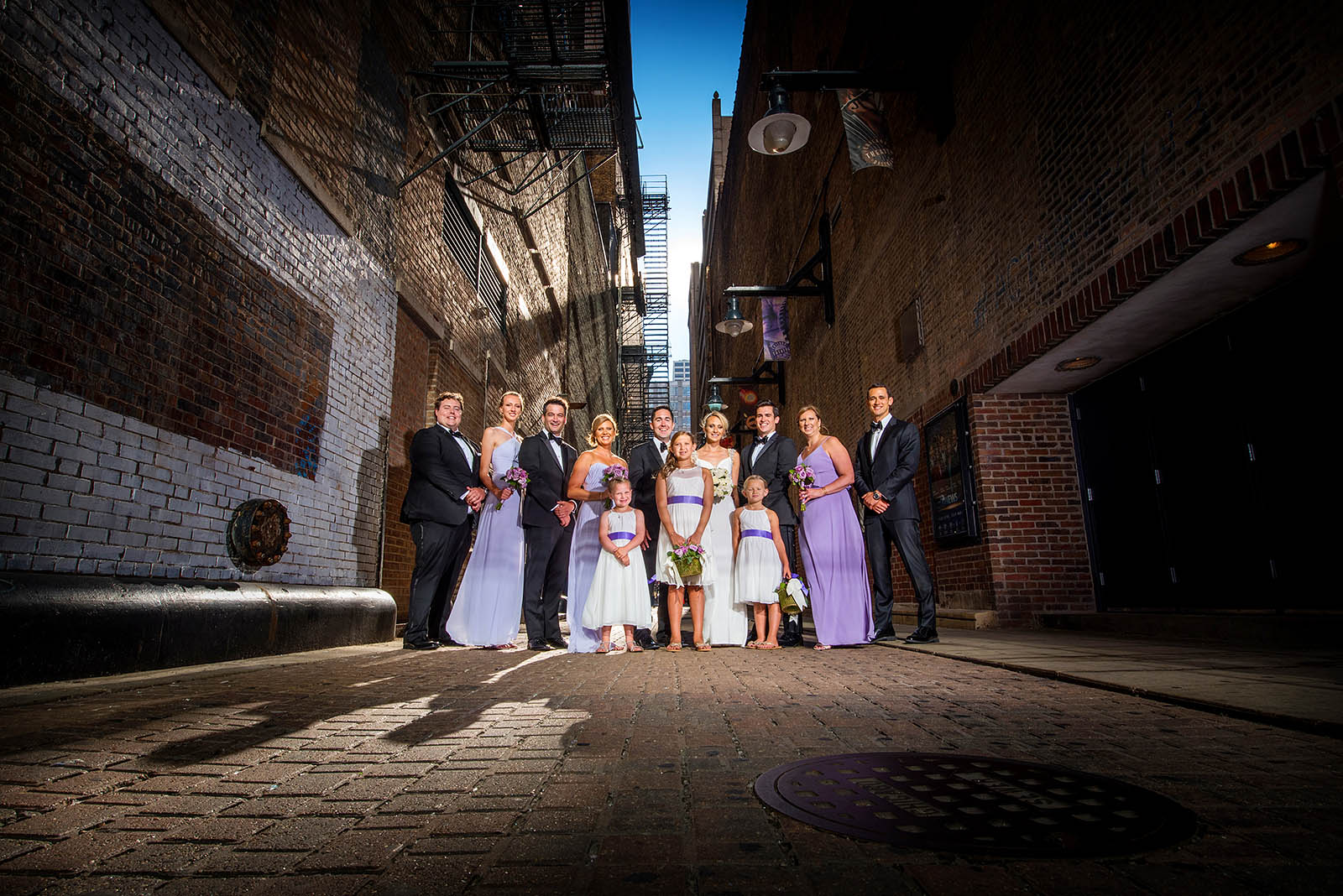 Best Wedding Party Portrait: Jackie and John’s 12 person purple-toned wedding party was photographed in the alley across from the Chicago Theater on State Street