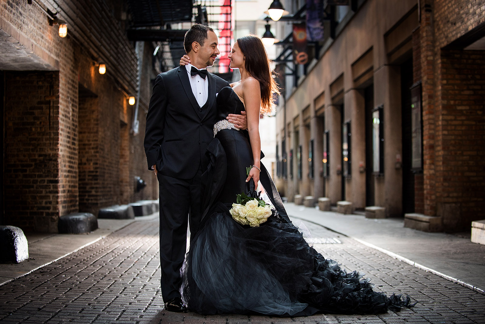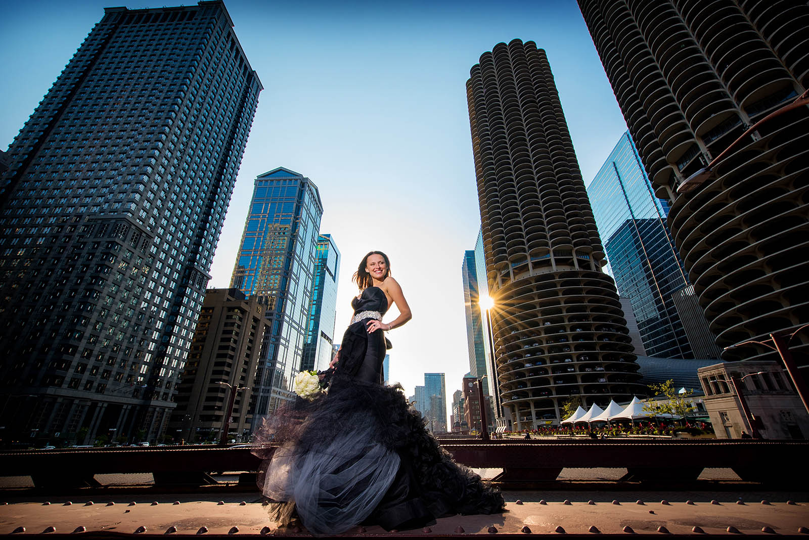 Best Black Wedding Dress: Justyna looked absolutely ravishing in her beautiful black wedding dress posing on top of the State Street Bridge along the Chicago skyline