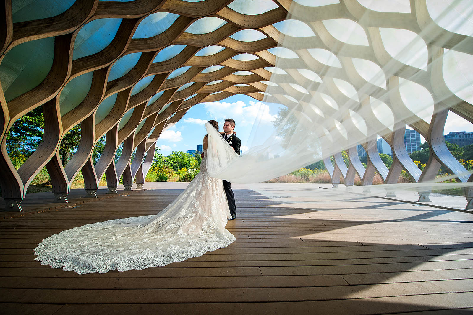 Best Wedding Veil: Jean’s veil caught the breeze under the Honeycomb (People’s Gas Education Pavilion) in Lincoln Park Zoo’s South Pond Nature Boardwalk