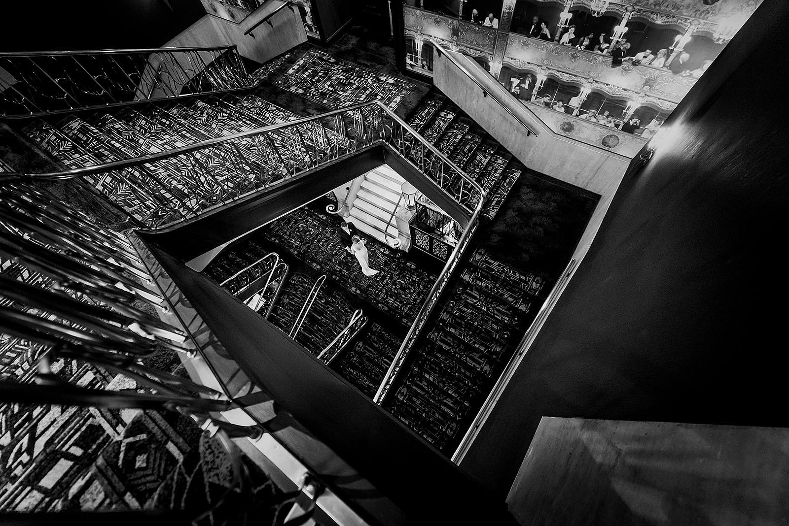 Best Black & White Wedding Photo: Mandy descended the staircase of the Allegro Hotel in Chicago for her First Look in this year’s best Black and White wedding photo