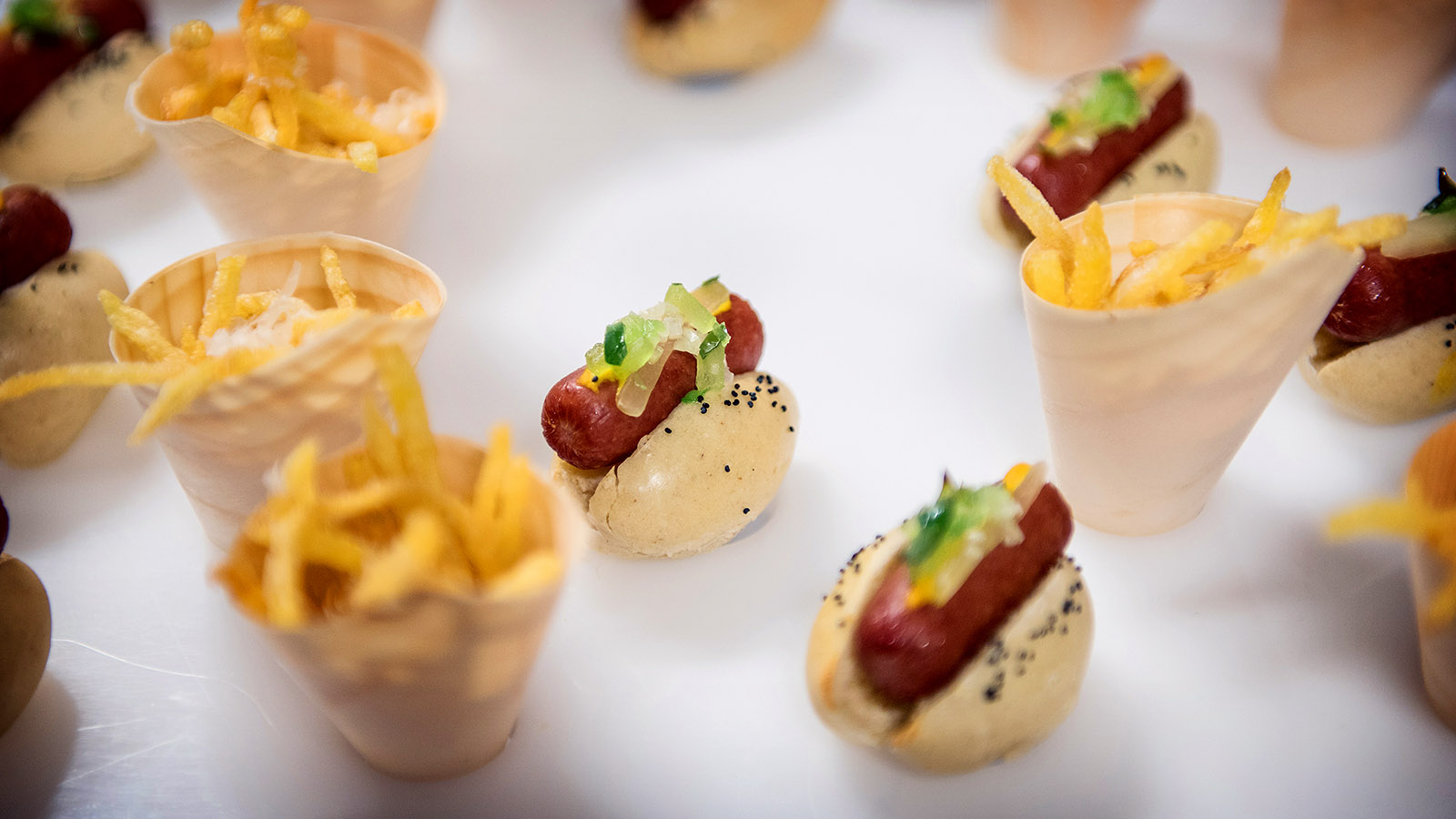 Best Late Night Wedding Snacks (1 of 2): Brique sets the stage with their truffle salted mac ‘n cheese bites and saffron polenta cake appetizers but steals the show with their late night hors d’oeuvres featuring mini hot dogs and tiny french fries