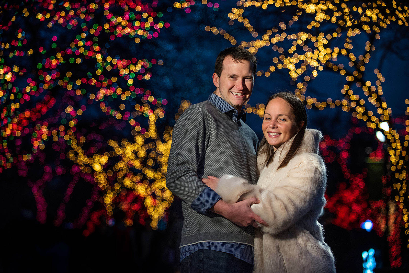 Best Holiday Lights Engagement Photo: Nathan and Ellie braved the cold to capture this colorful Christmas lights photo at the Lincoln Park Zoo Lights in Chicago