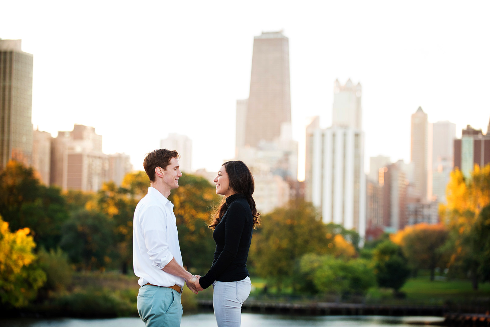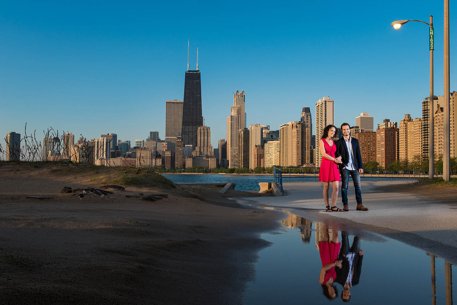 Best Chicago Skyline Engagement Session Reflection: Alyssa & Juan reflecting in front of the Chicago skyline during their Sunrise Engagement Session along Lake Michigan