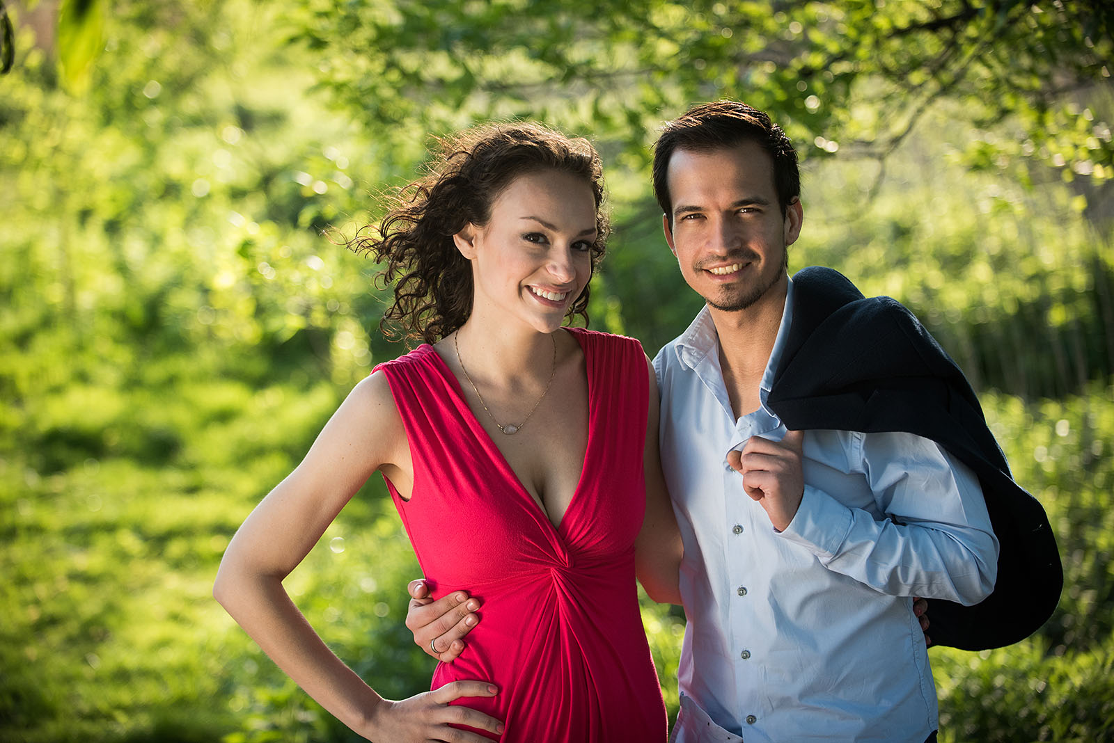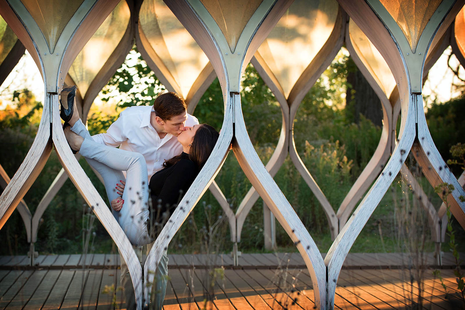 Best Red Dress: Traditionally a Red Dress will steal attention away from both subjects during an engagement session but Alyssa gracefully manages to compliment Juan during their sunrise engagement session in Lincoln Park Zoo’s South Pond Nature Boardwalk