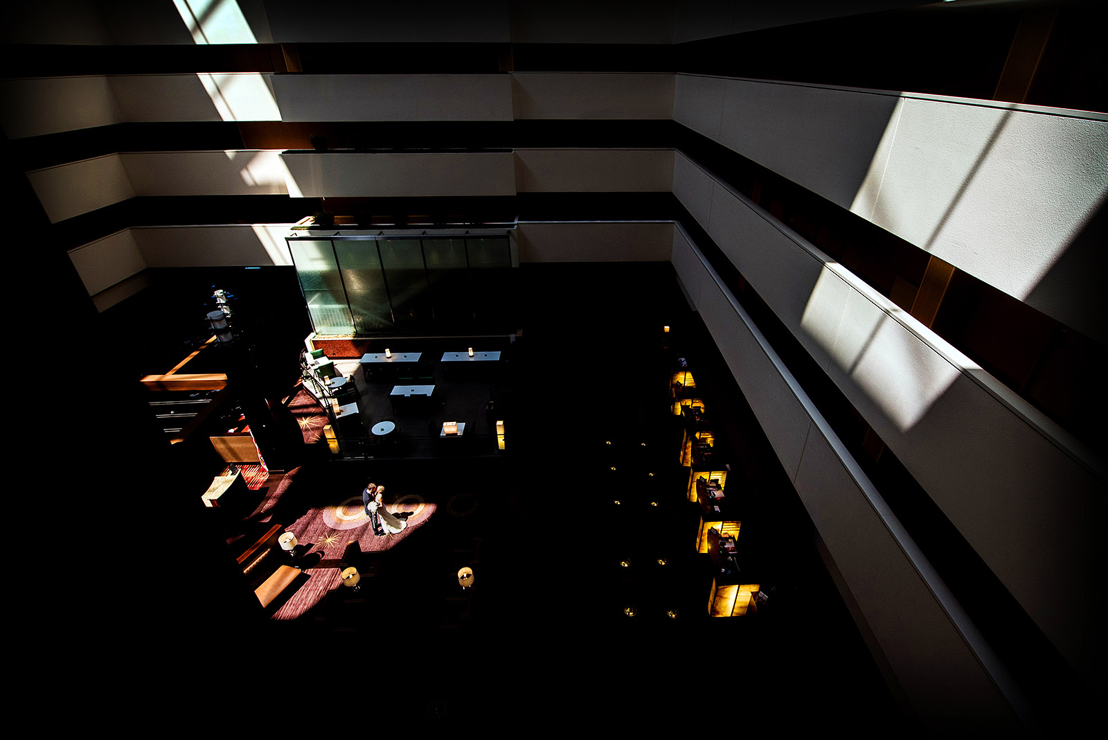 Best First Look: Kim and Jesse really stood out against this beam of light in the lobby of the Holiday Inn Merchandise Mart Chicago